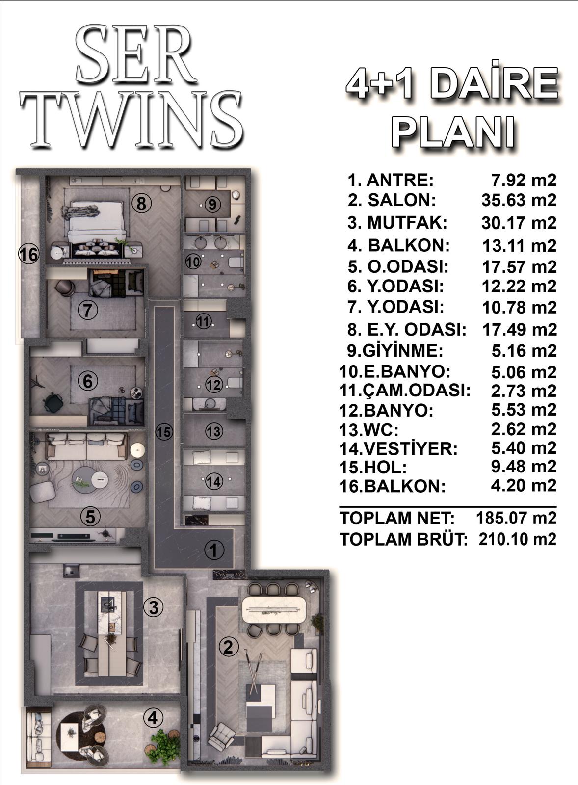 Ser Twins, özellikle geniş daire konseptiyle ailelere yönelik tasarlanmıştır. 4+1 dairelerde yer alan geniş yaşam alanları, çoklu oda düzeni ve fonksiyonel kullanım alanları; hem yaşam kalitesini artırır hem de uzun vadeli konut ihtiyacına yanıt verir.